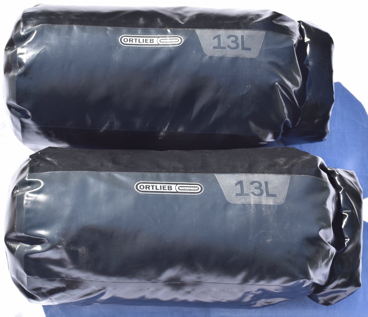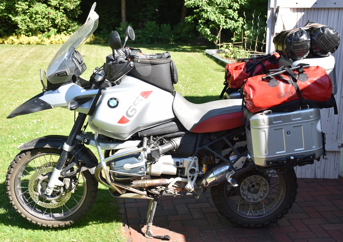 Auf dem Motorrad sind zusätzlich zu den Koffern und dem Tankrucksack unsere beiden Schlafsäcke auf dem Topcase und zwei Taschen mit unseren Klamotten (Tasche Brigitte, Tasche Wolle) jeweils auf den Seitenkoffern anzubringen.