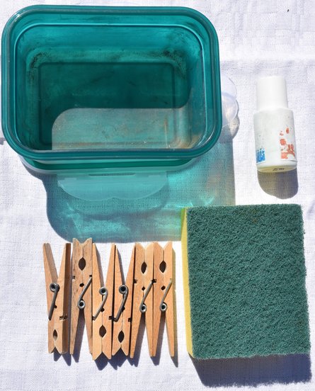 Box mit Spülmittel/Schwamm und Wäscheklammern